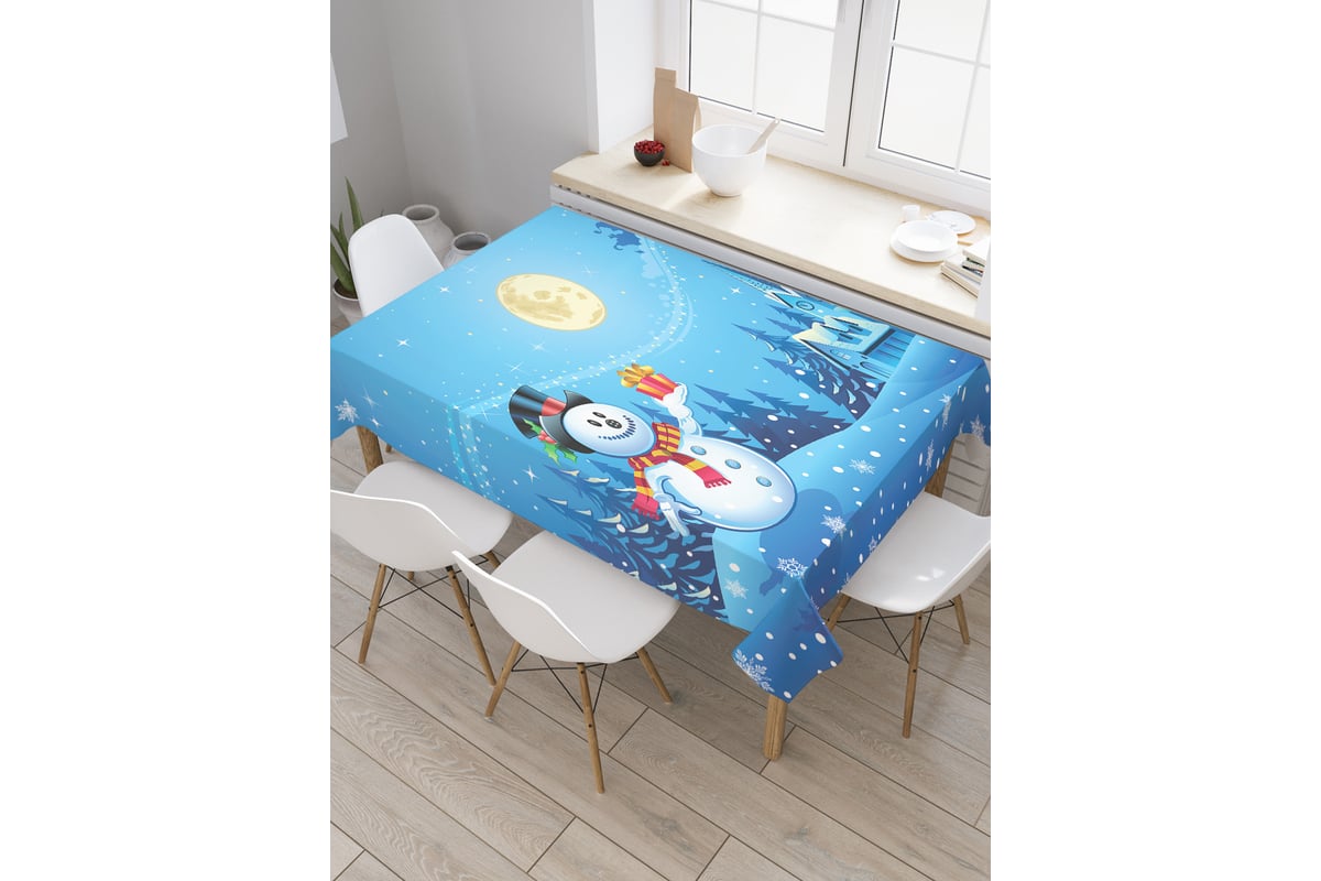 Прямоугольная скатерть JoyArty Снеговик с подарком из сатена tc_20278_120x145