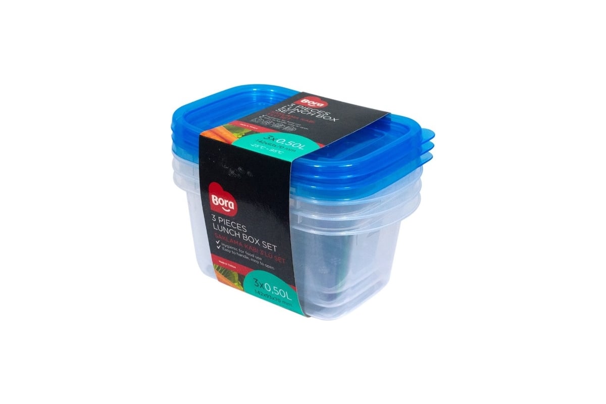 Прямоугольный контейнер BORA 0.5 л, ДхШхВ 142x93x70 мм, 3 штуки в упаковке, крышка синяя, пластик ПЛ-BO534s