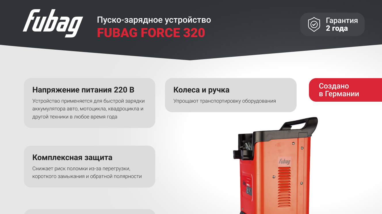 Преимущества пуско-зарядного устройства FUBAG FORCE 320