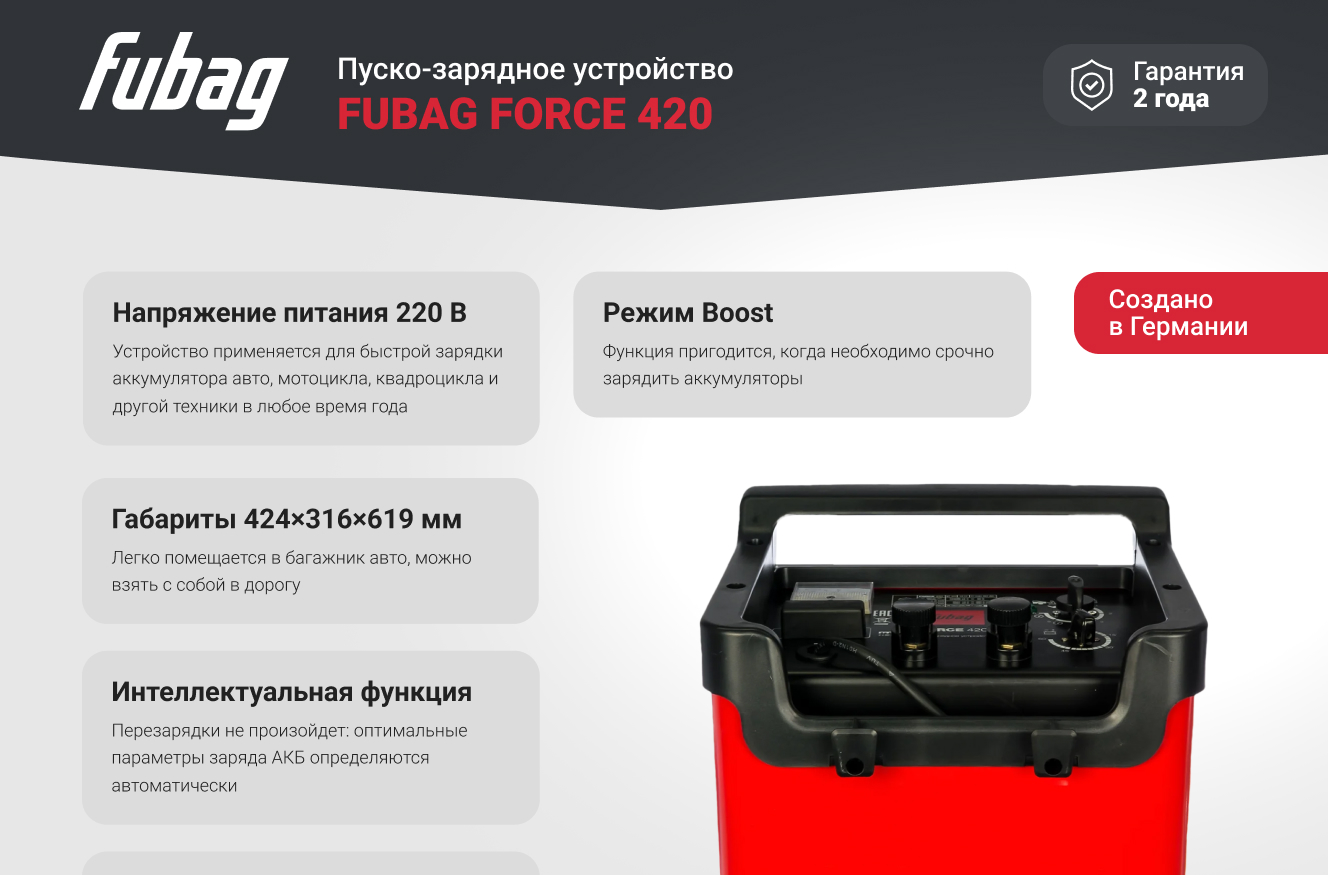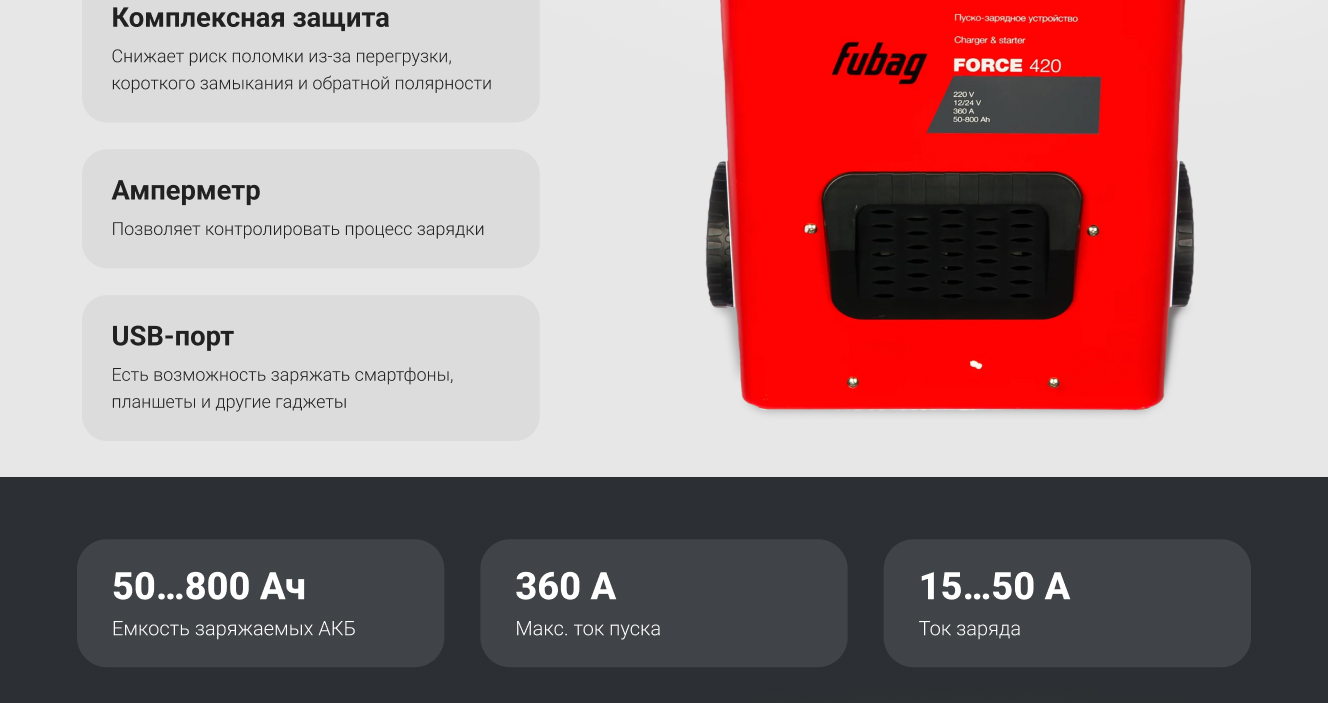 Преимущества пуско-зарядного устройства FUBAG FORCE 420