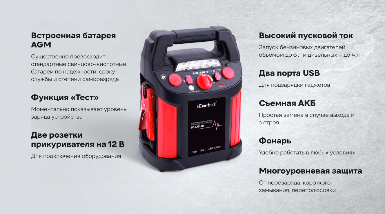 Многофункциональное пусковое устройство для автомобиля iCartool IC-CBL18 предназначено для широкого спектра задач: