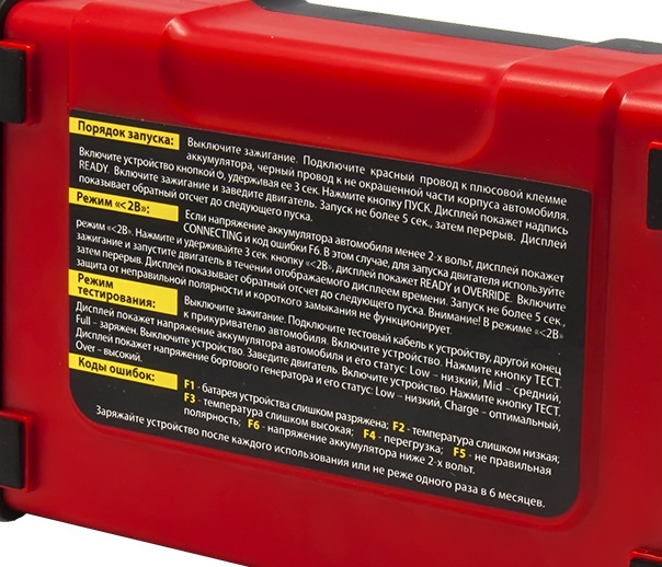 - Специальный режим (<2В) позволяет использовать устройство для абсолютно "мертвых" аккумуляторов или для запуска двигателей без аккумулятора;