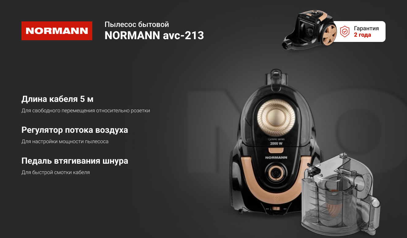 Пылесос бытовой NORMANN avc-213 2000 вт циклон, пылесборник 3 л N16013-1
