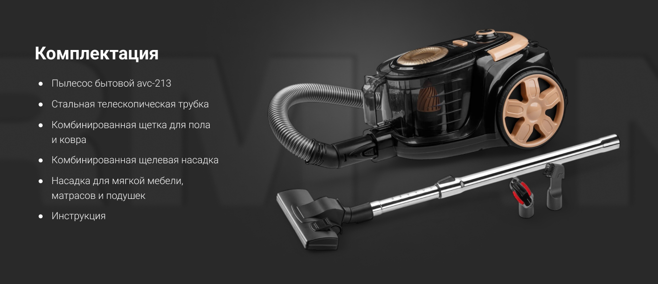 Пылесос NORMANN AVC-213 (N16013-1) - мощное устройство с циклонным фильтром и высокой мощностью всасывания. Пылесос оснащен стальной телескопической трубкой всасывания, что позволяет легко отрегулировать высоту, подходящую под Ваш рост. В комплекте есть комбинированная щетка для пола/ковра, щелевая насадка и насадка для мягкой мебели, матрацев и подушек. А большой пылесборник объёмом 3 л позволит реже производить очистку пылесоса.