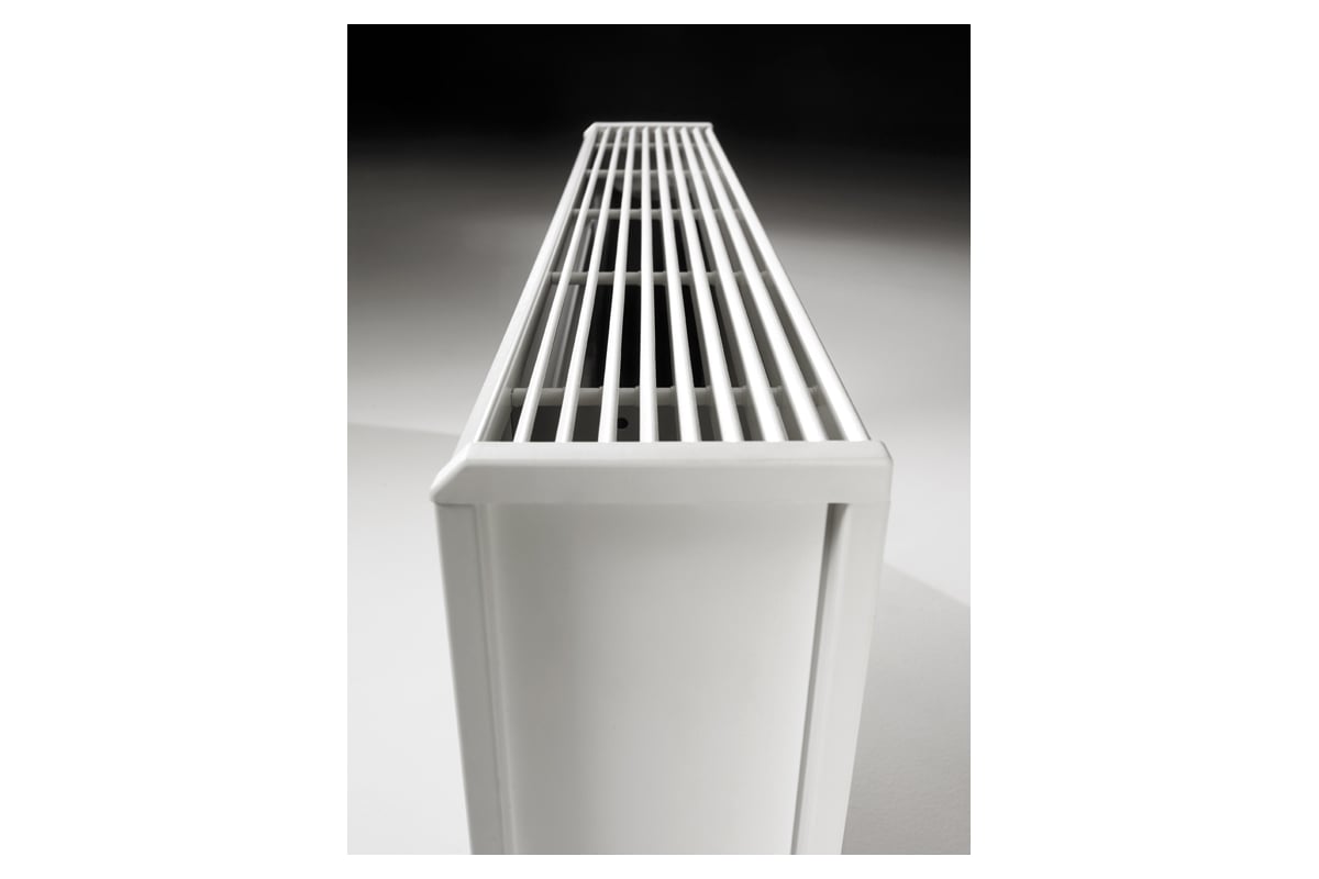 Двойной теплообменник для лучшей компенсации нисходящего потока холодного воздуха рядом с застекленными фасадами или вентиляционными решетками.