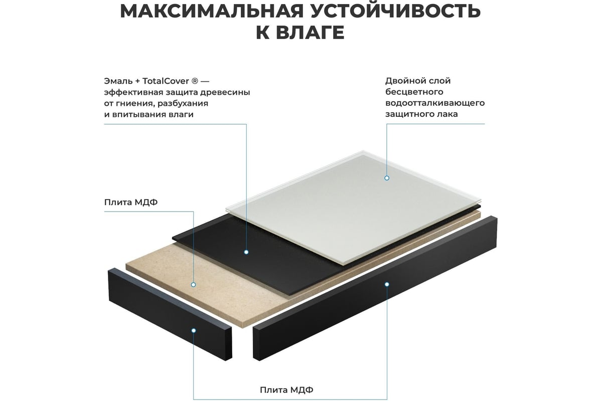 Основа столешницы из дерева Genuine Tree – высококачественная импрегнированная плита МДФ, пропитанная специальным составом для усиления стойкости материала и максимальной защиты от влаги. Последующая многоступенчатая отделка поверхности сопровождается нанесением водоотталкивающей эмали и специального защитного покрытия TotalCover® для максимальной устойчивости к влаге и потенциальным химическим обработкам изделия в процессе уборки ванной комнаты.