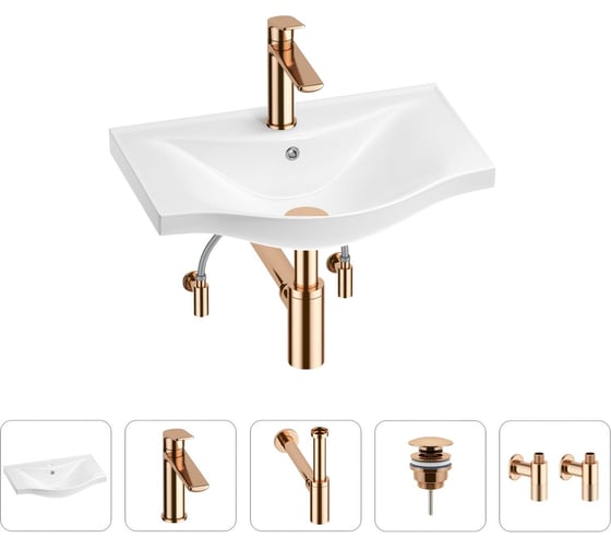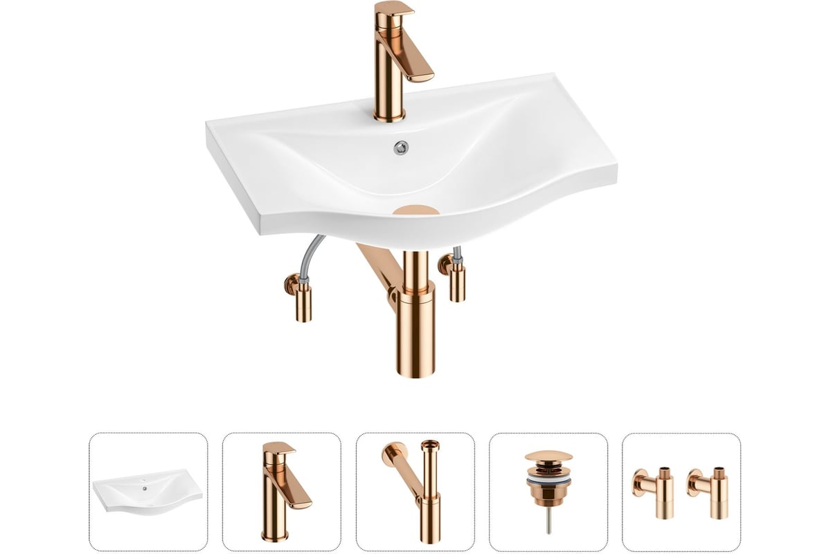 - 1 х керамическая раковина, арт. 151202000 (размер 50*37 см, цвет глянцевый белый); 1 x декоративная заглушка на отверстие перелива раковины (цвет хром); 1 х смеситель для раковины, арт. 182304000 (цвет розовое золото); 2 х гибкая подводка для подключения смесителя, 45 см; 1 x сифон для раковины, арт. 182107000 (цвет розовое золото); 1 x универсальный донный клапан для раковины, арт. 182142000 (цвет розовое золото); 2 x угловой вентиль, арт. 182149000 (цвет розовое золото); 1 x комплект креплений для монтажа; 5 x инструкция по монтажу и эксплуатации; 5 x гарантийный талон.