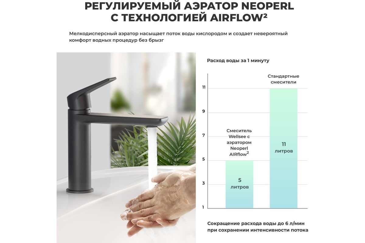 - Регулируемый аэратор Neoperl с технологией AIRflow² позволяет скорректировать направление потока, уменьшает разбрызгивание и приглушает шум воды