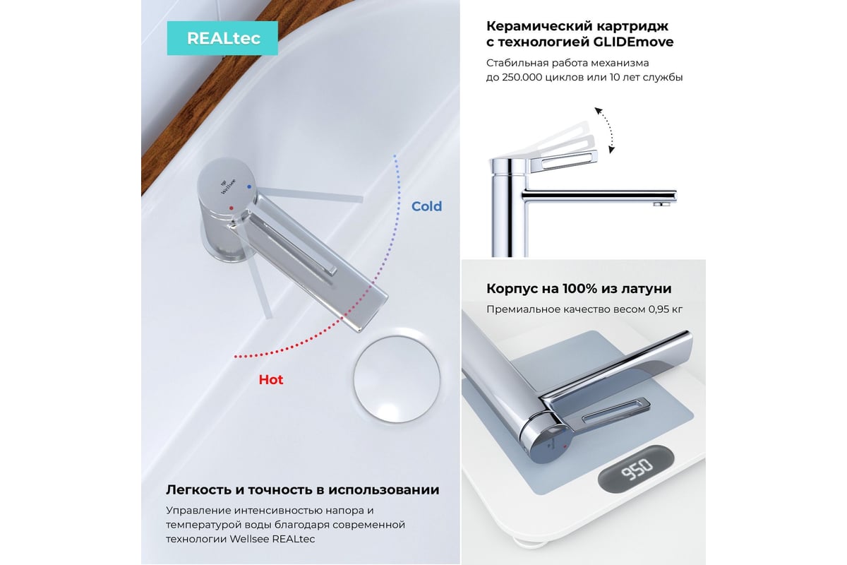 - Надежный латунный смеситель с испанским картриджем 35 мм обеспечивает высокую точность управления напором и температурой воды