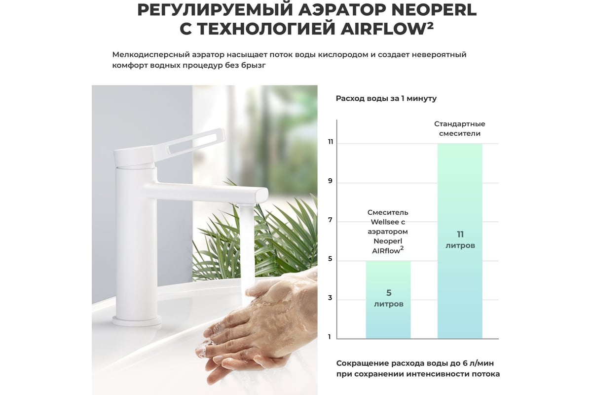 - Регулируемый аэратор Neoperl с технологией AIRflow² позволяет скорректировать направление потока, уменьшает разбрызгивание и приглушает шум воды