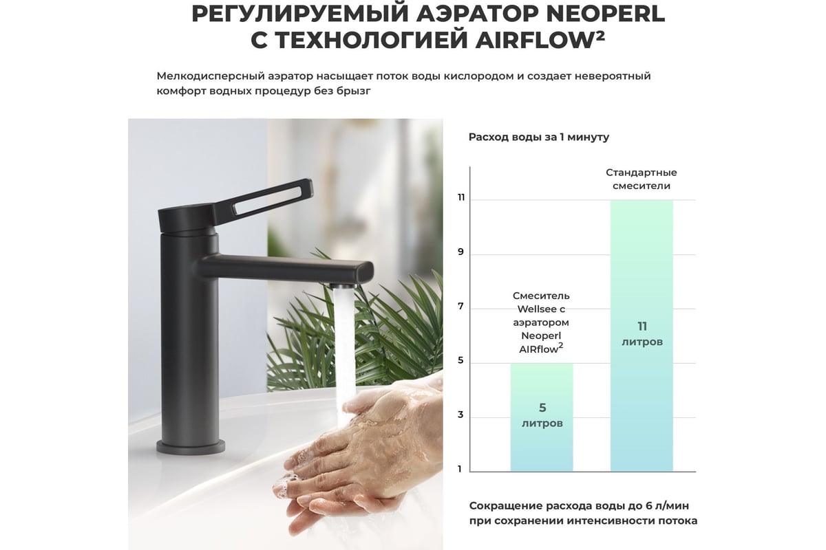 - Регулируемый аэратор Neoperl с технологией AIRflow² позволяет скорректировать направление потока, уменьшает разбрызгивание и приглушает шум воды