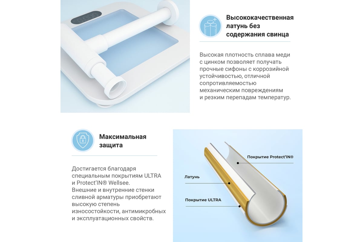 Латунный сифон Drainage System отличается высокой прочностью и долговечностью, устойчив к коррозии, повреждениям и высоким температурам. Внутренние стенки изделия имеют специальное защитное покрытие Protect’IN, препятствующее скоплению грязи и оседанию водопроводных примесей и солей.