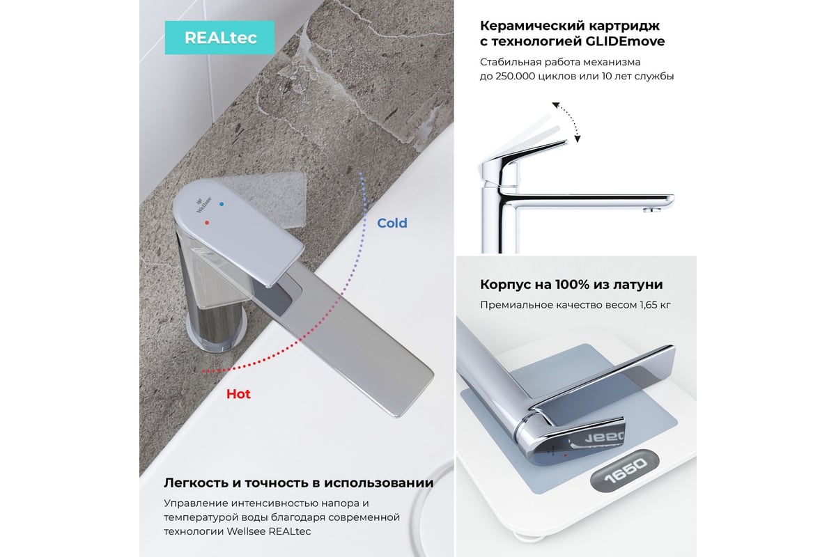 - Надежный латунный смеситель с испанским картриджем 35 мм обеспечивает высокую точность управления напором и температурой воды