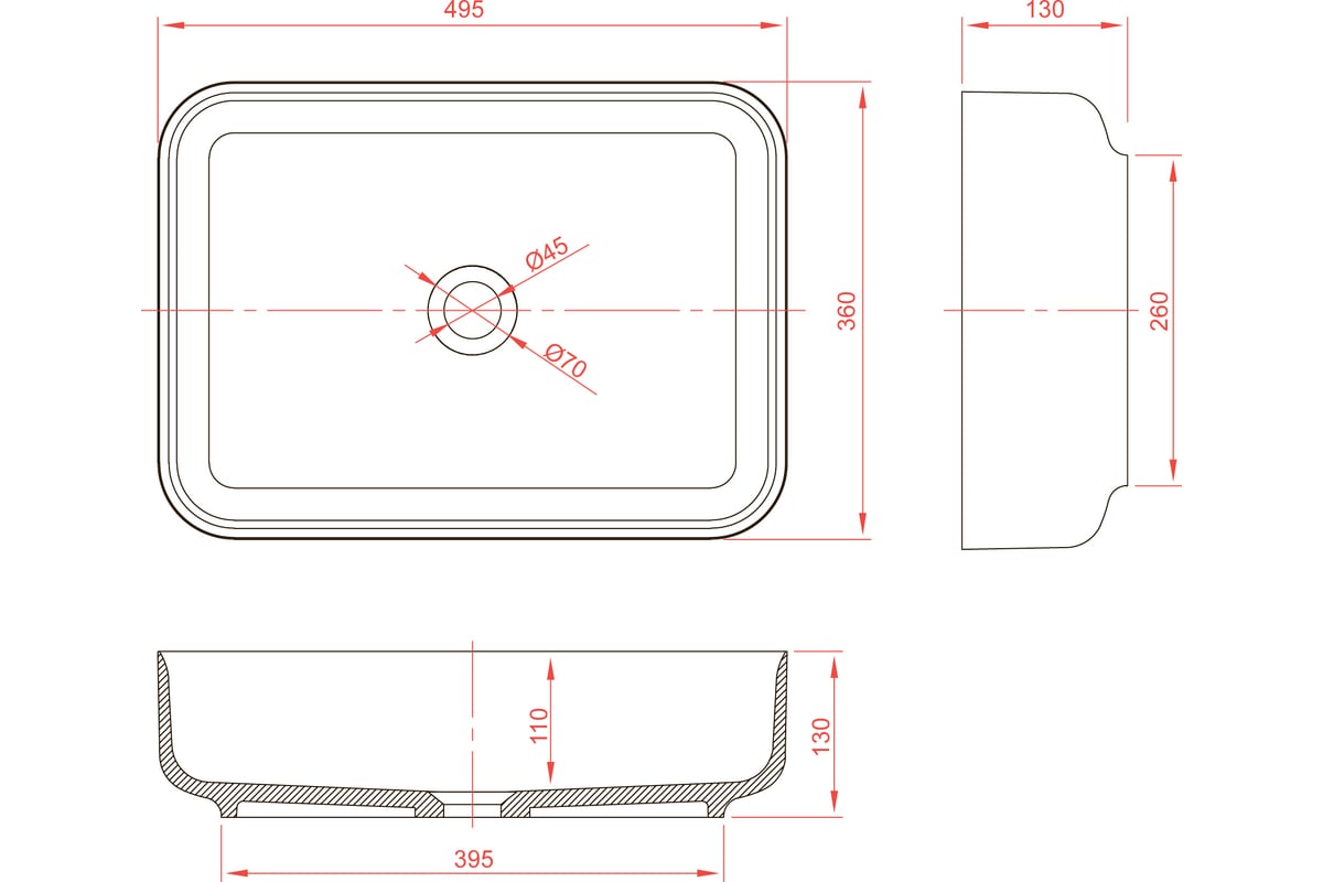 Форма раковины:прямоугольная