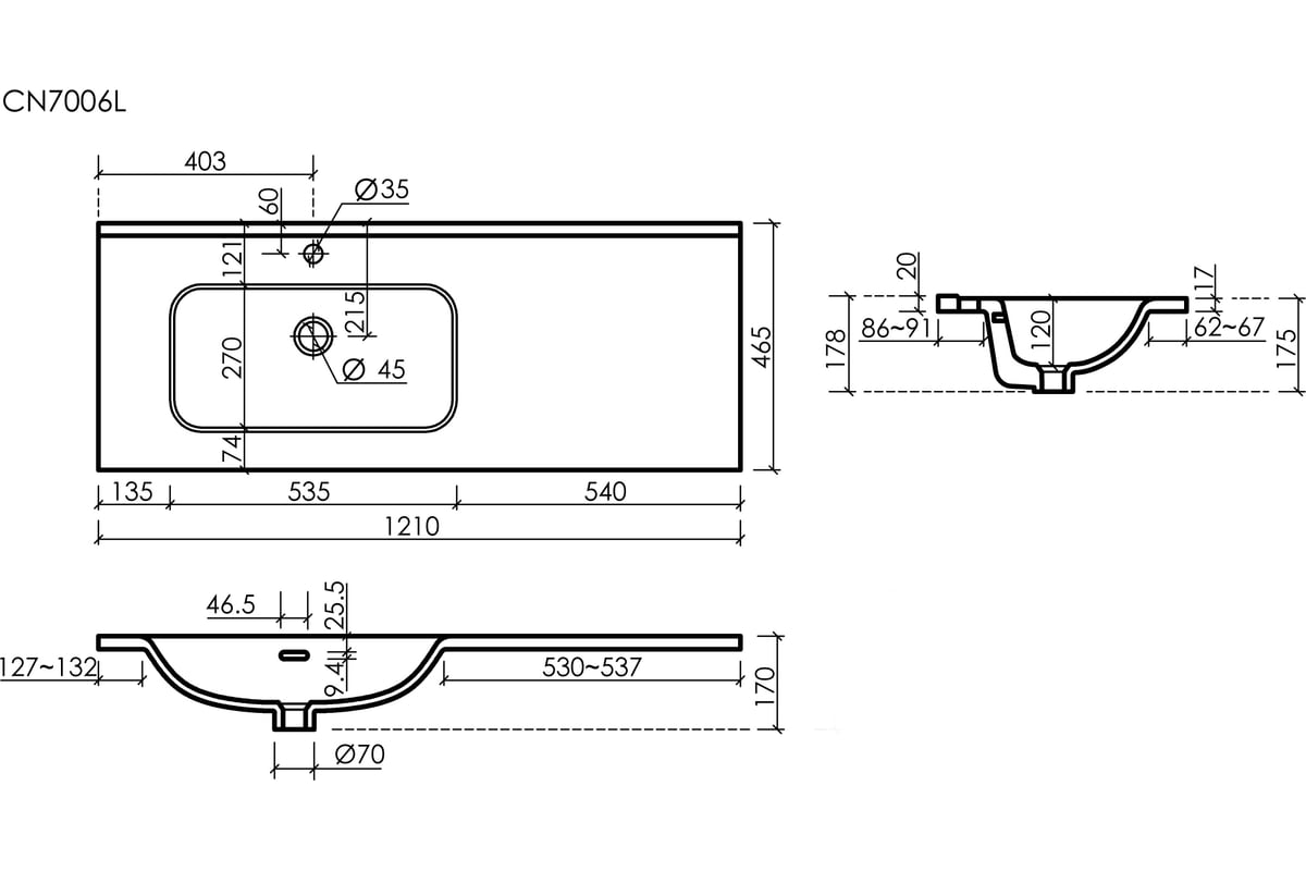 Раковина накладная мебельная Ceramicanova Element с отверстием под смеситель чаша слева 1210x465x180 мм цвет белый CN7006L
