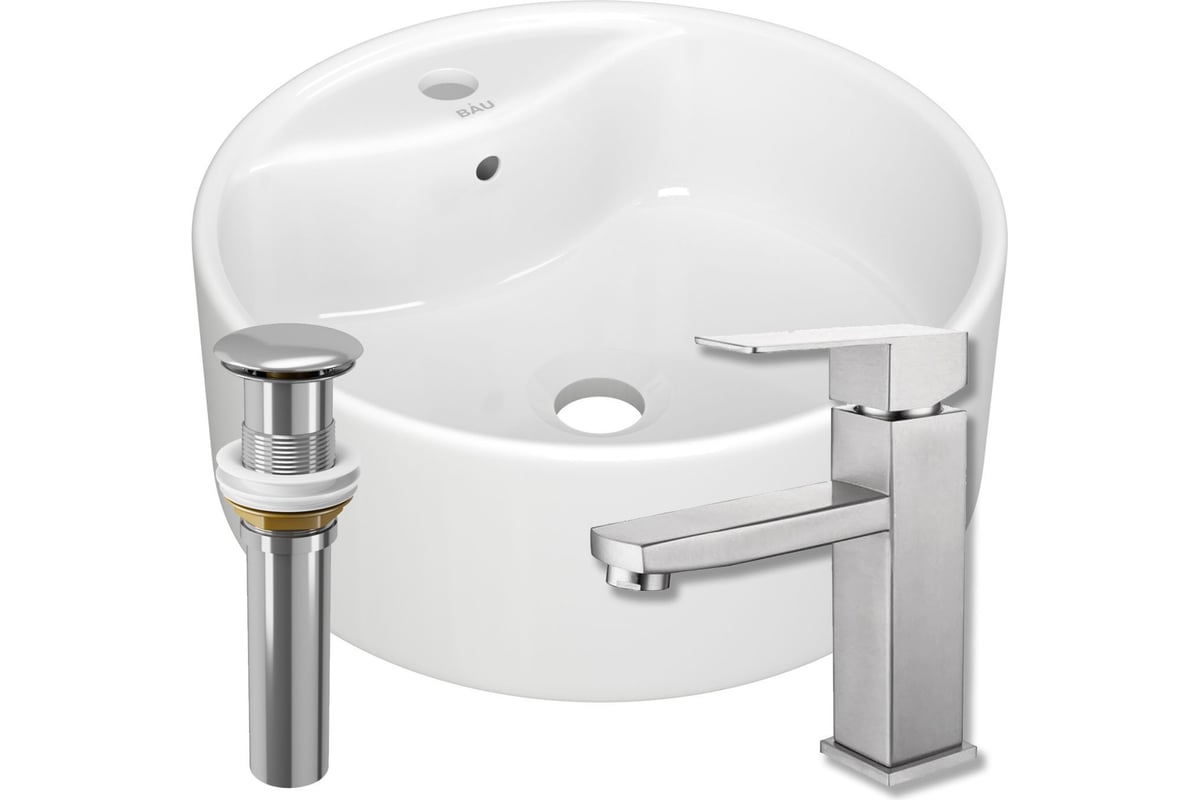 Раковина накладная со смесителем и выпуском Bauedge BAU (D40, белая + смеситель Hotel Still, нер. сталь, выпуск клик-клак хром) BH1226