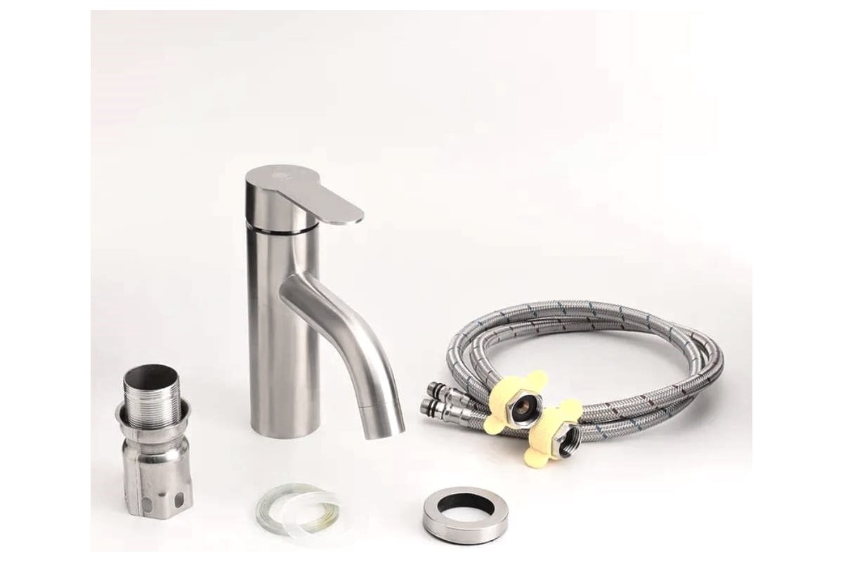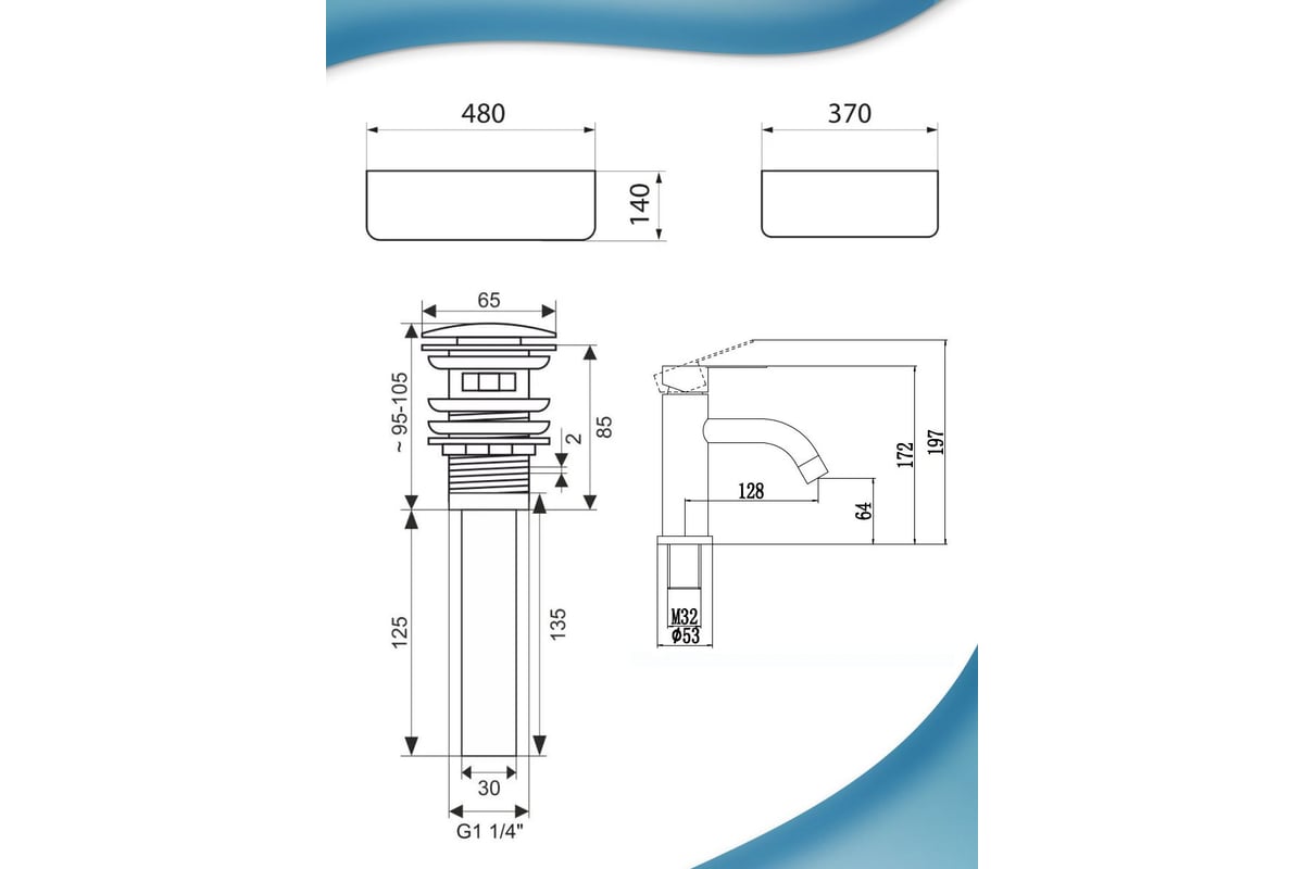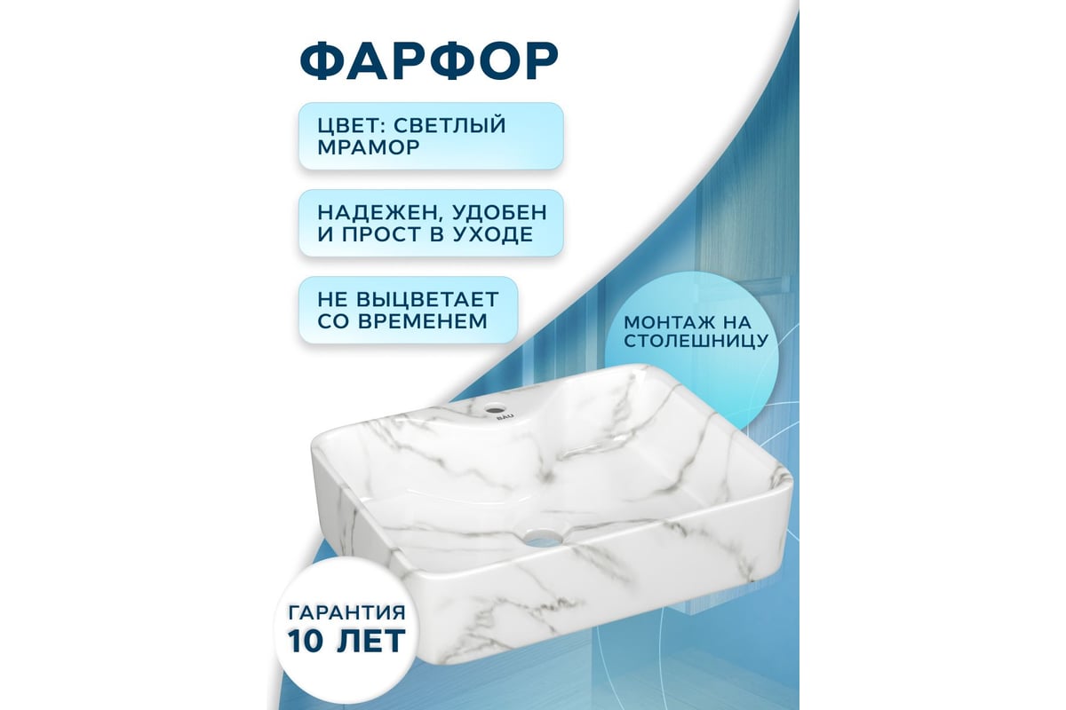 Раковина накладная со смесителем и выпуском Bauedge BAU Cerama прямоугольная, 48x37, мрамор + смеситель Dream, нер. сталь, выпуск клик-клак хром YBD2563