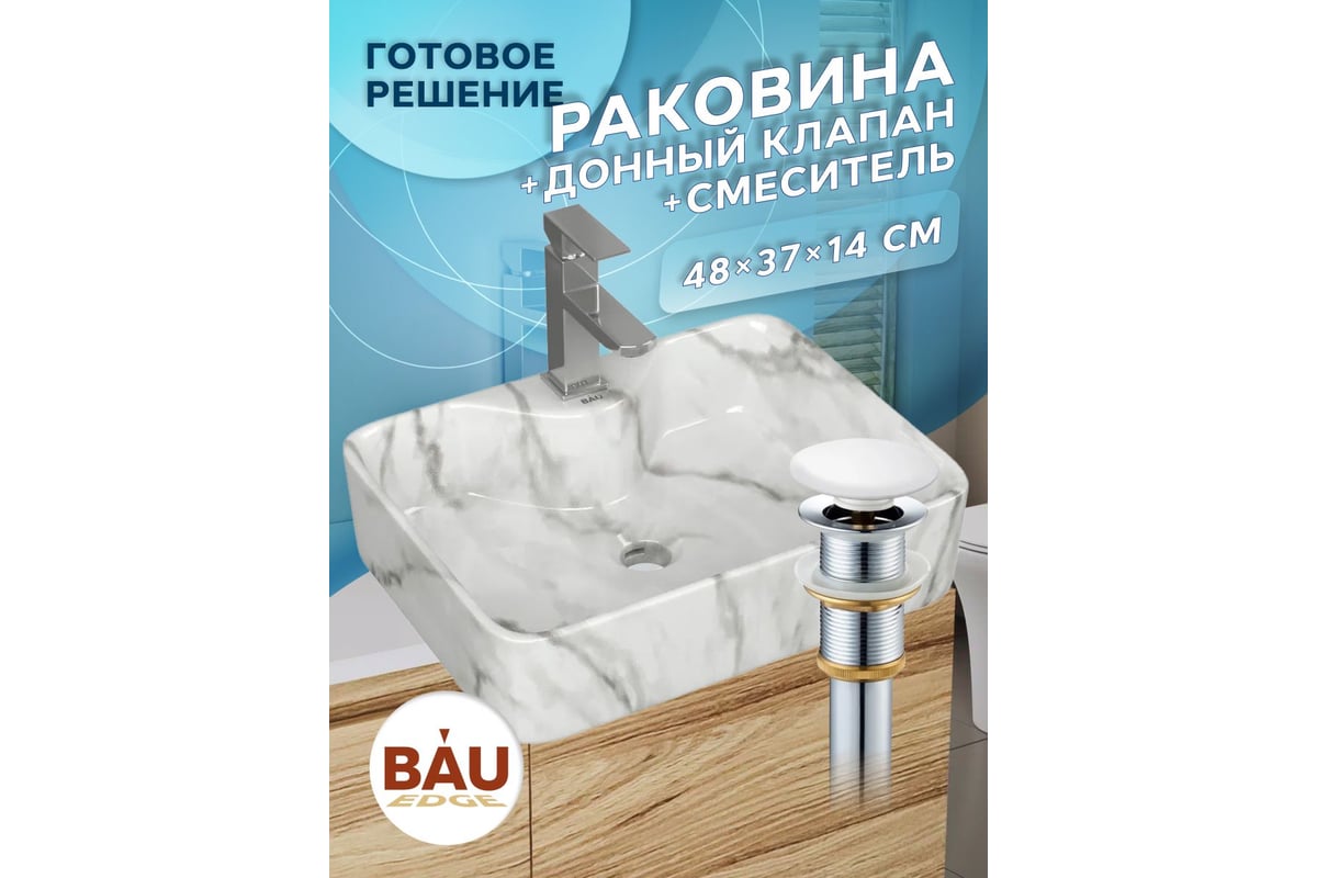 Раковина накладная со смесителем и выпуском прямоугольная Bauedge BAU Cerama 48x37, мрамор + смеситель Hotel Still, выпуск клик-клак белый YBD2560
