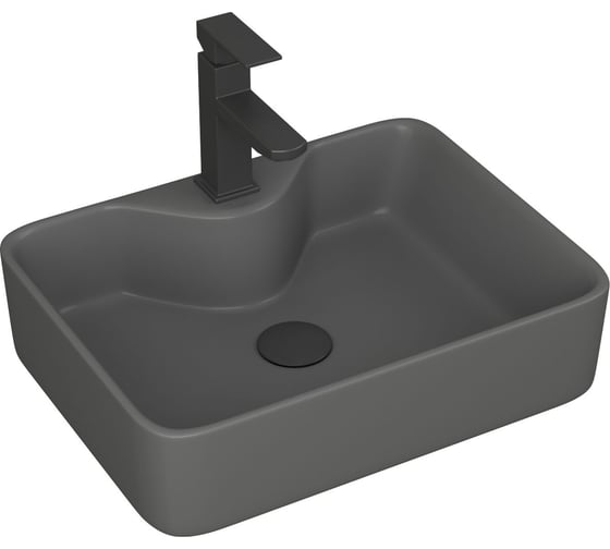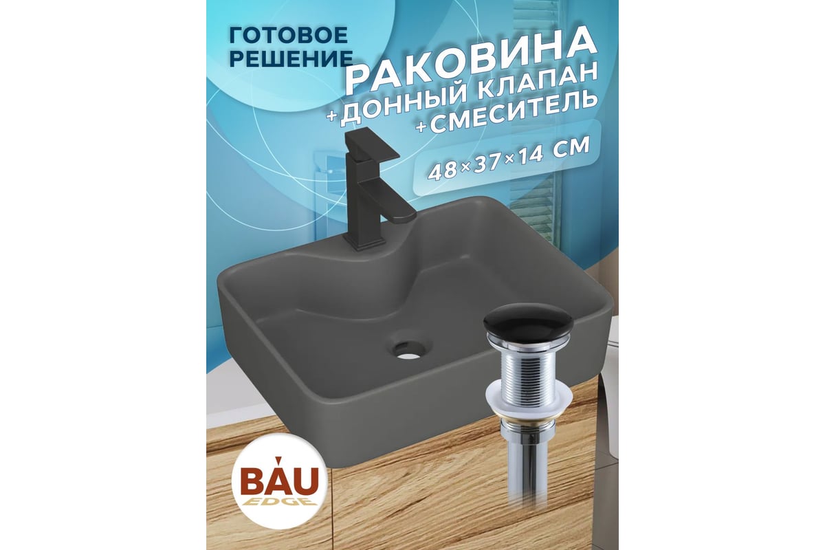 Раковина накладная со смесителем и выпуском прямоугольная Bauedge BAU Cerama 48x37, темно-серая матовая + смеситель Hotel Black, выпуск клик-клак черный YBD2546