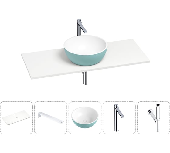 Раковина-столешница для ванной Wellsee La.lune в наборе 5 в 1: каменная раковина матового бирюзового/матового белого цвета, столешница 100 см, кронштейны, смеситель, сифон 202006256