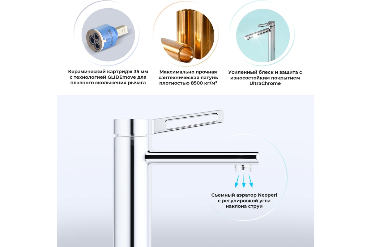 Цельнолитой латунный корпус выдерживает перепады давления, противостоит гидроударам, не накапливает электричество, пыль. Тщательно спроектированная длина и высота излива создают дополнительные удобства для выполнения бытовых задач. Вода, соприкасающаяся с поверхностью латуни в изливе, обеззараживается – уменьшается количество патогенных бактерий и грибков.