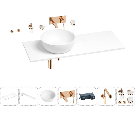 Раковина-столешница с чашей слева Wellsee La.lune в наборе 10 в 1: раковина, столешница 130 см, кронштейны, смеситель, сифон, аксессуары (цвет набора розовое золото) 202004918