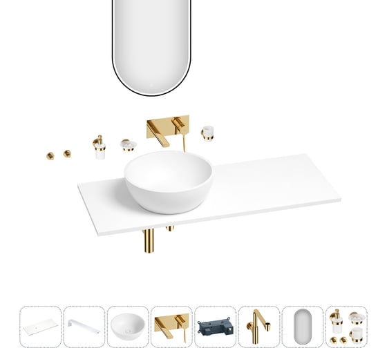 Раковина-столешница с чашей слева Wellsee La.lune в наборе 11 в 1: раковина, столешница 120 см, кронштейны, смеситель, сифон, аксессуары, зеркало (цвет набора золото) 202005287