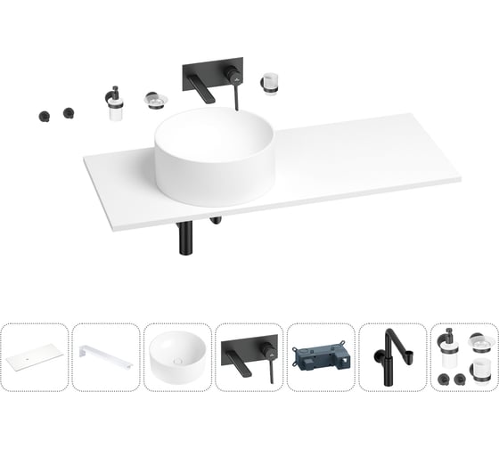 Раковина-столешница с чашей слева Wellsee Le.charme в наборе 10 в 1: раковина, столешница 100 см, кронштейны, смеситель, сифон, аксессуары (цвет набора матовый черный) 202004961