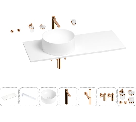 Раковина-столешница с чашей слева Wellsee Le.charme в наборе 10 в 1: раковина, столешница 120 см, кронштейны, смеситель, сифон, вентили, аксессуары (цвет набора розовое золото) 202003371