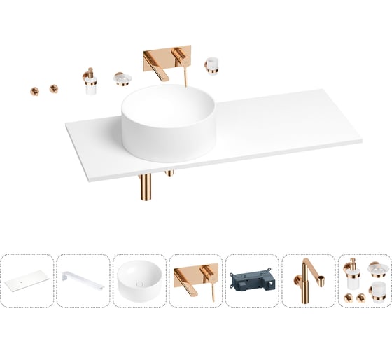 Раковина-столешница с чашей слева Wellsee Le.charme в наборе 10 в 1: раковина, столешница 130 см, кронштейны, смеситель, сифон, аксессуары (цвет набора розовое золото) 202005003