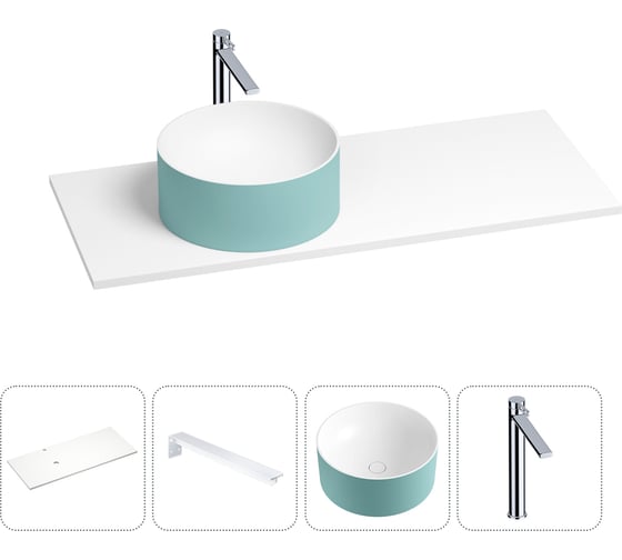 Раковина-столешница с чашей слева Wellsee Le.charme в наборе 4 в 1: раковина из камня с подвесной столешницей 100 см (цвет матовый бирюзовый/матовый белый), кронштейны, смеситель 202006017