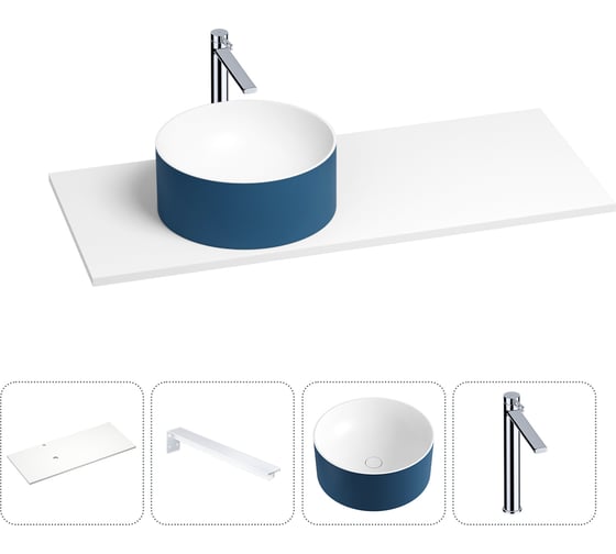 Раковина-столешница с чашей слева Wellsee Le.charme в наборе 4 в 1: раковина из камня с подвесной столешницей 100 см (цвет матовый темно-синий/матовый белый), кронштейны, смеситель 202006000