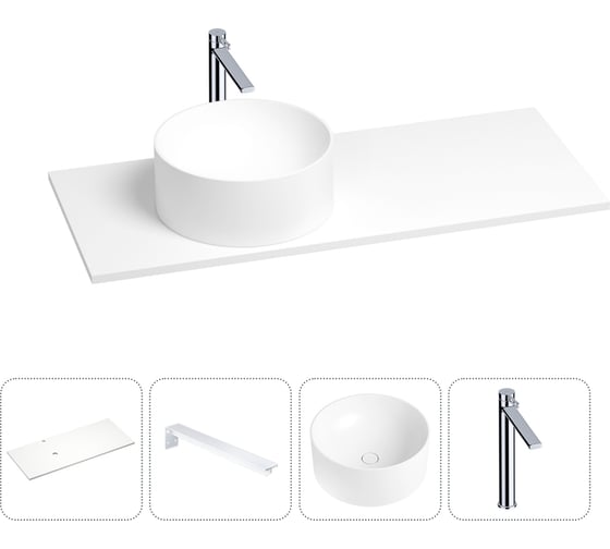 Раковина-столешница с чашей слева Wellsee Le.charme в наборе 4 в 1: раковина из камня со столешницей 130 см, кронштейны для подвесного монтажа, смеситель (хром) 202002228