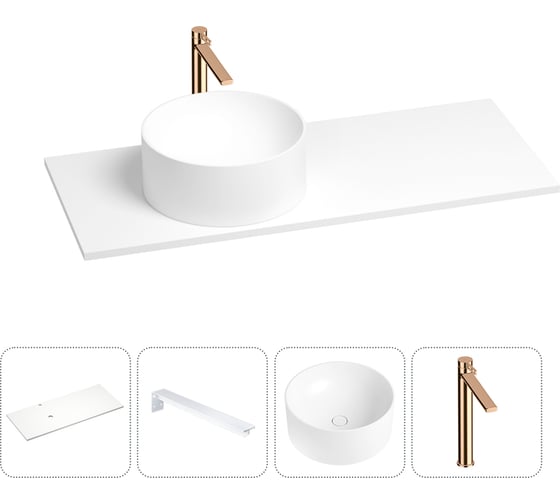 Раковина-столешница с чашей слева Wellsee Le.charme в наборе 4 в 1: раковина из камня со столешницей 130 см, кронштейны для подвесного монтажа, смеситель (розовое золото) 202002231