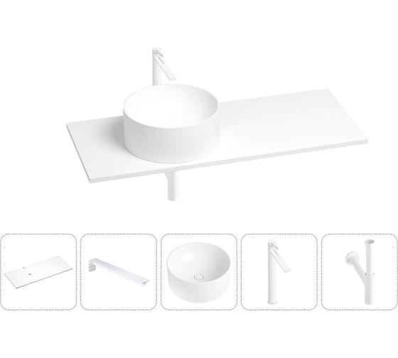 Раковина-столешница с чашей слева Wellsee Le.charme в наборе 5 в 1: раковина из камня со столешницей 120 см, кронштейны для подвесного монтажа, смеситель и сифон (матовый белый) 202002602