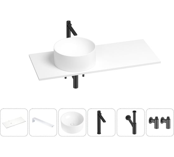 Раковина-столешница с чашей слева Wellsee Le.charme в наборе 6 в 1: раковина, столешница 100 см, кронштейны, смеситель, сифон, вентили (цвет набора матовый черный) 202002959