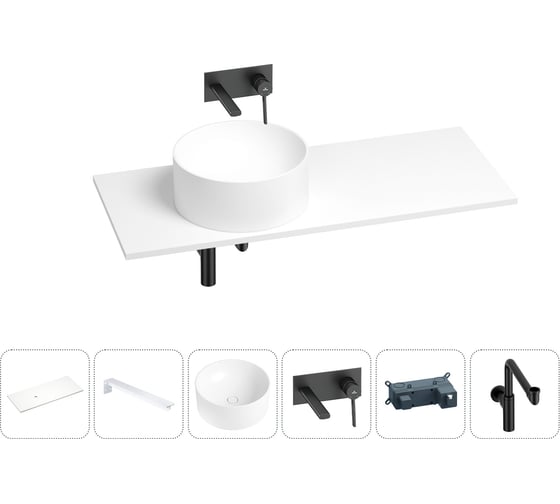 Раковина-столешница с чашей слева Wellsee Le.charme в наборе 6 в 1: раковина, столешница 120 см, кронштейны, смеситель, сифон (цвет набора матовый черный) 202004601