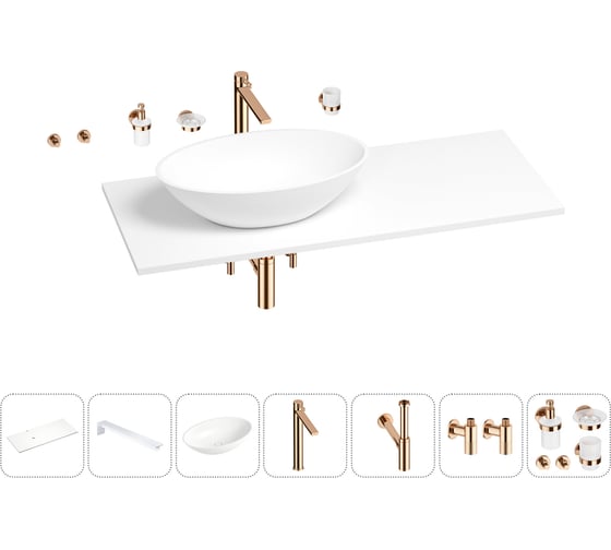 Раковина-столешница с чашей слева Wellsee Le.huit.mars в наборе 10 в 1: раковина, столешница 100 см, кронштейны, смеситель, сифон, вентили, аксессуары (цвет набора розовое золото) 202003121