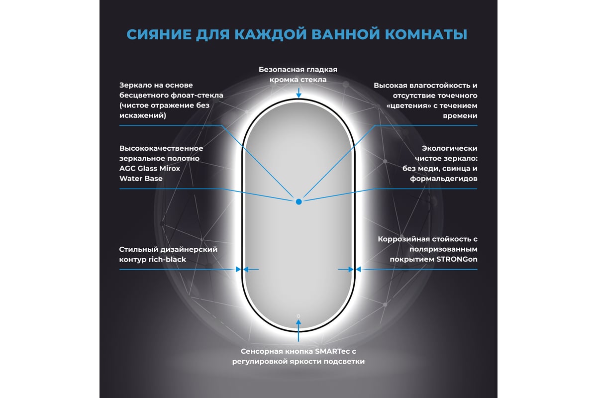 Японское стекло с идеальной геометрией создает отражение без искажений, защищено от коррозии, «цветения», влажности.