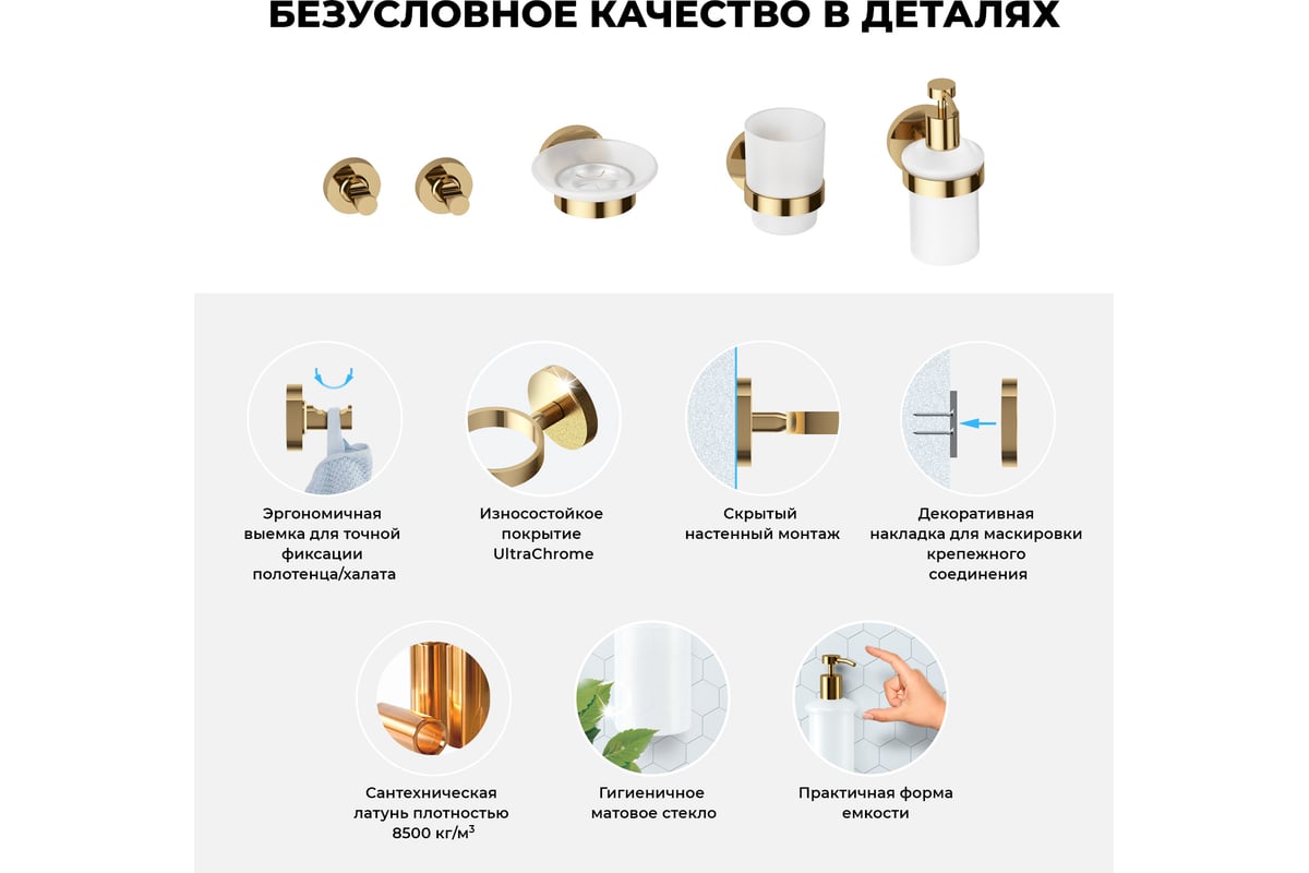 Коллекция включает дозатор, стакан, мыльницу, крючок. Крючок из латуни надежно удерживает текстиль.