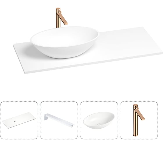 Раковина-столешница с чашей слева Wellsee Le.huit.mars в наборе 4 в 1: раковина из камня со столешницей 120 см, кронштейны для подвесного монтажа, смеситель (розовое золото) 202001991