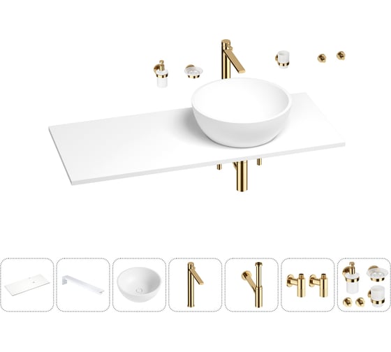 Раковина-столешница с чашей справа Wellsee La.lune в наборе 10 в 1: раковина, столешница 100 см, кронштейны, смеситель, сифон, вентили, аксессуары (цвет набора золото) 202003265