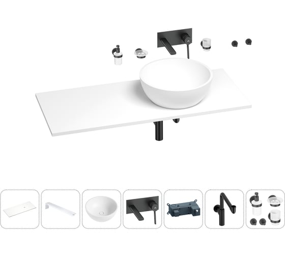 Раковина-столешница с чашей справа Wellsee La.lune в наборе 10 в 1: раковина, столешница 120 см, кронштейны, смеситель, сифон, аксессуары (цвет набора матовый черный) 202004906