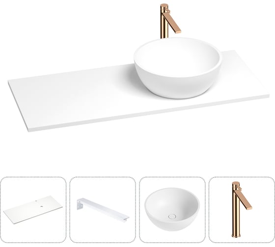 Раковина-столешница с чашей справа Wellsee La.lune в наборе 4 в 1: раковина из камня со столешницей 120 см, кронштейны для подвесного монтажа, смеситель (розовое золото) 202002136