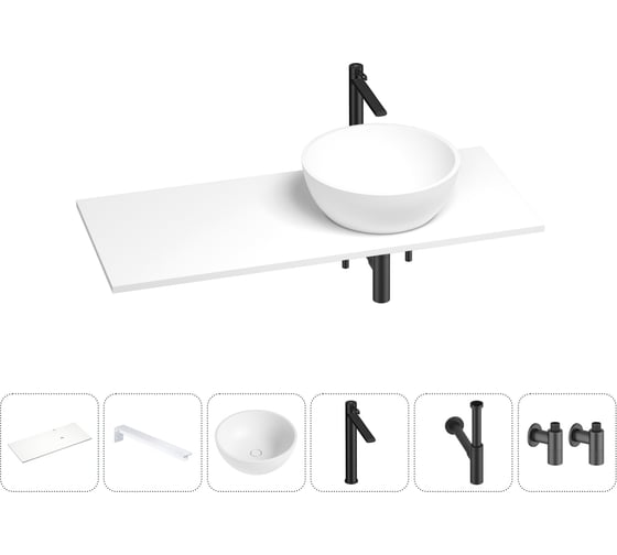 Раковина-столешница с чашей справа Wellsee La.lune в наборе 6 в 1: раковина, столешница 120 см, кронштейны, смеситель, сифон, вентили (цвет набора матовый черный) 202002904