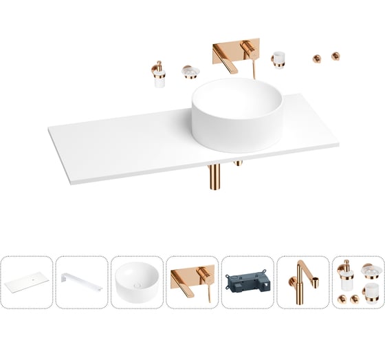 Раковина-столешница с чашей справа Wellsee Le.charme в наборе 10 в 1: раковина, столешница 120 см, кронштейны, смеситель, сифон, аксессуары (цвет набора розовое золото) 202004993