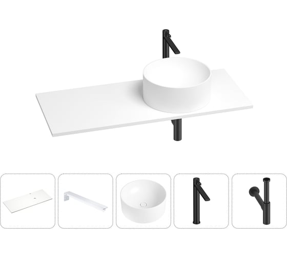 Раковина-столешница с чашей справа Wellsee Le.charme в наборе 5 в 1: раковина из камня со столешницей 100 см, кронштейны для подвесного монтажа, смеситель и сифон (матовый черный) 202002579