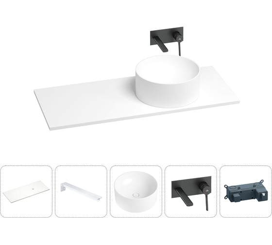 Раковина-столешница с чашей справа Wellsee Le.charme в наборе 5 в 1: раковина из камня со столешницей 100 см, кронштейны для подвесного монтажа, смеситель (матовый черный) 202004196