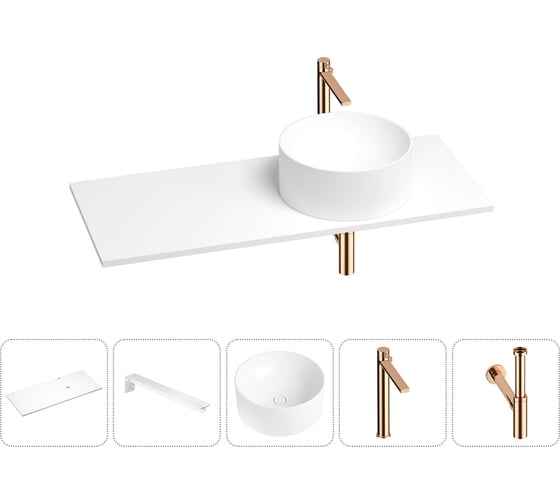 Раковина-столешница с чашей справа Wellsee Le.charme в наборе 5 в 1: раковина из камня со столешницей 130 см, кронштейны для подвесного монтажа, смеситель и сифон (розовое золото) 202002621