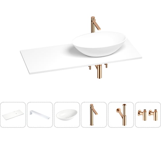 Раковина-столешница с чашей справа Wellsee Le.huit.mars в наборе 6 в 1: раковина, столешница 100 см, кронштейны, смеситель, сифон, вентили (цвет набора розовое золото) 202002741